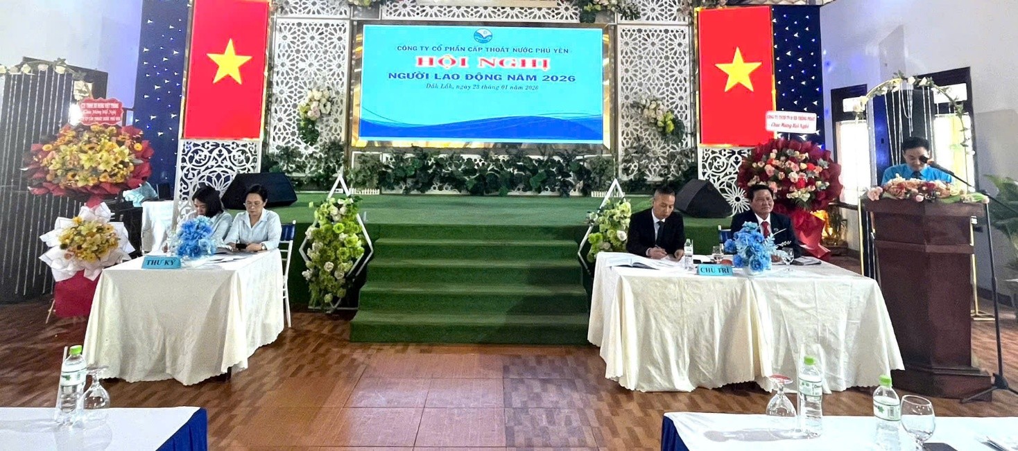 Ngày 23/01/2026, tại phường Tuy Hoà, tỉnh Đắk Lắk Công ty cổ phần Cấp thoát nước nước Phú Yên đã long trọng tổ chức Hội nghị Người lao động năm 2026 nhằm đánh giá kết quả thực hiện Nghị quyết Hội nghị Người lao động năm 2025, xác định phương hướng nhiệm vụ năm 2026.